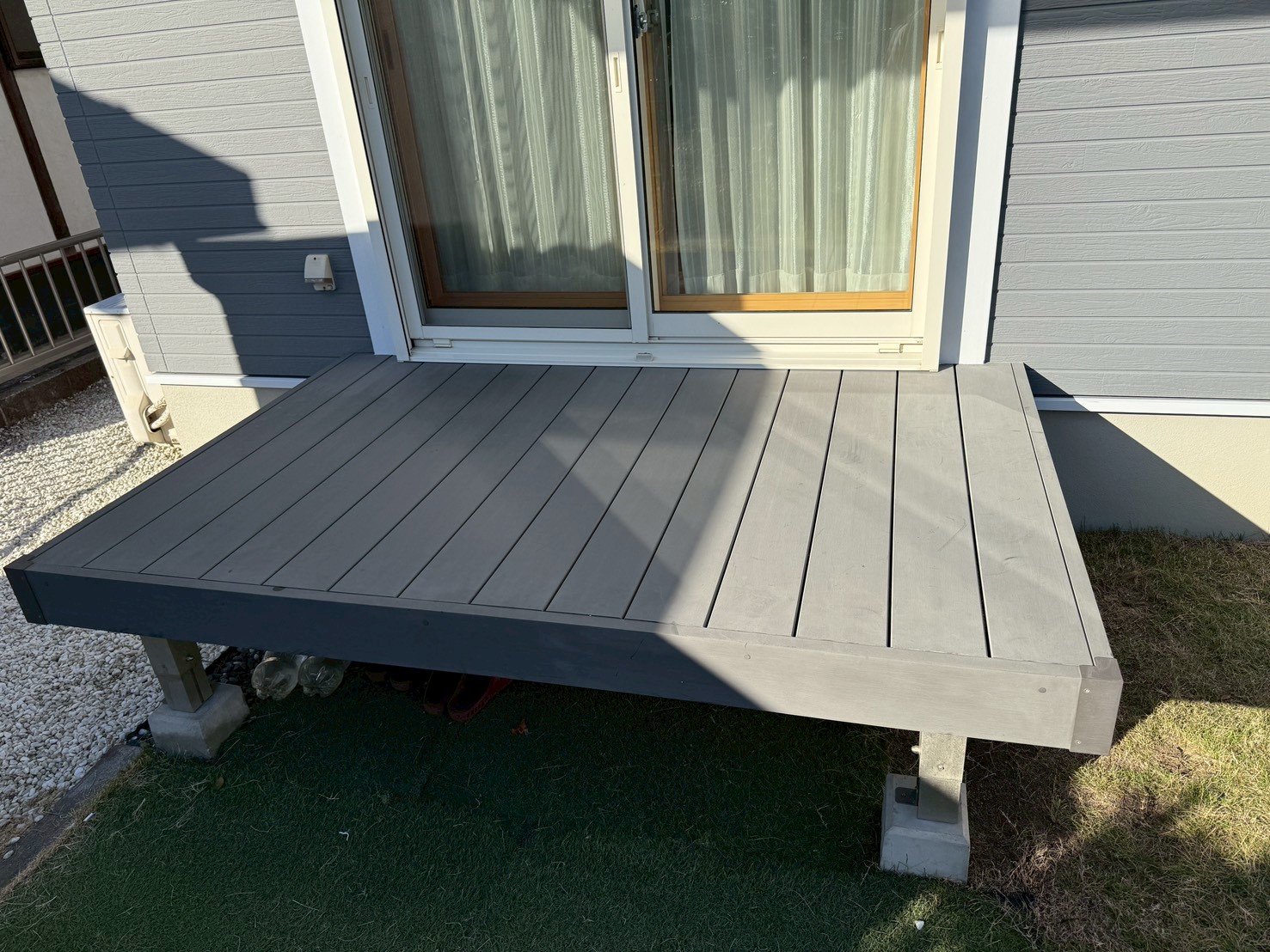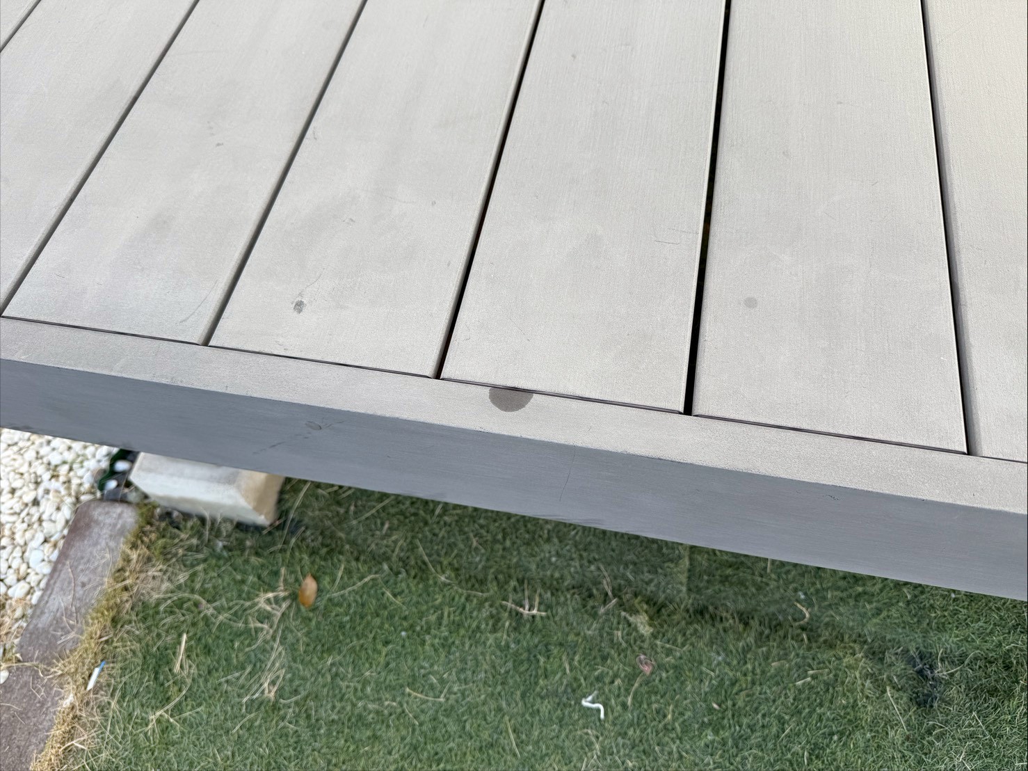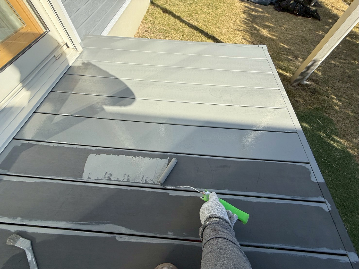 外壁・デッキテラス部・掃除、ケレン処理塗り替え施工:現状色、グレーの塗装です。