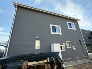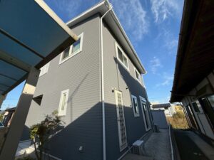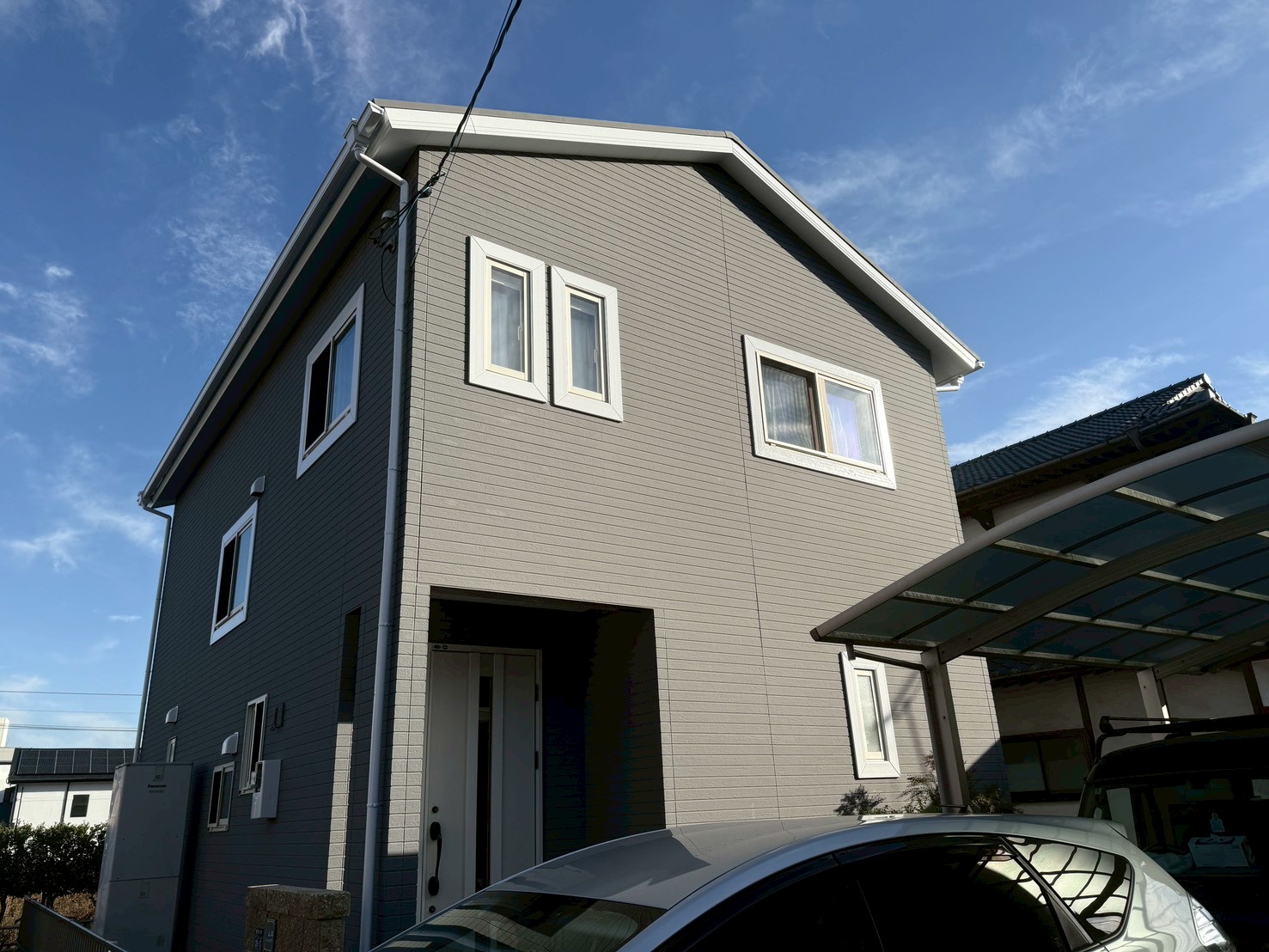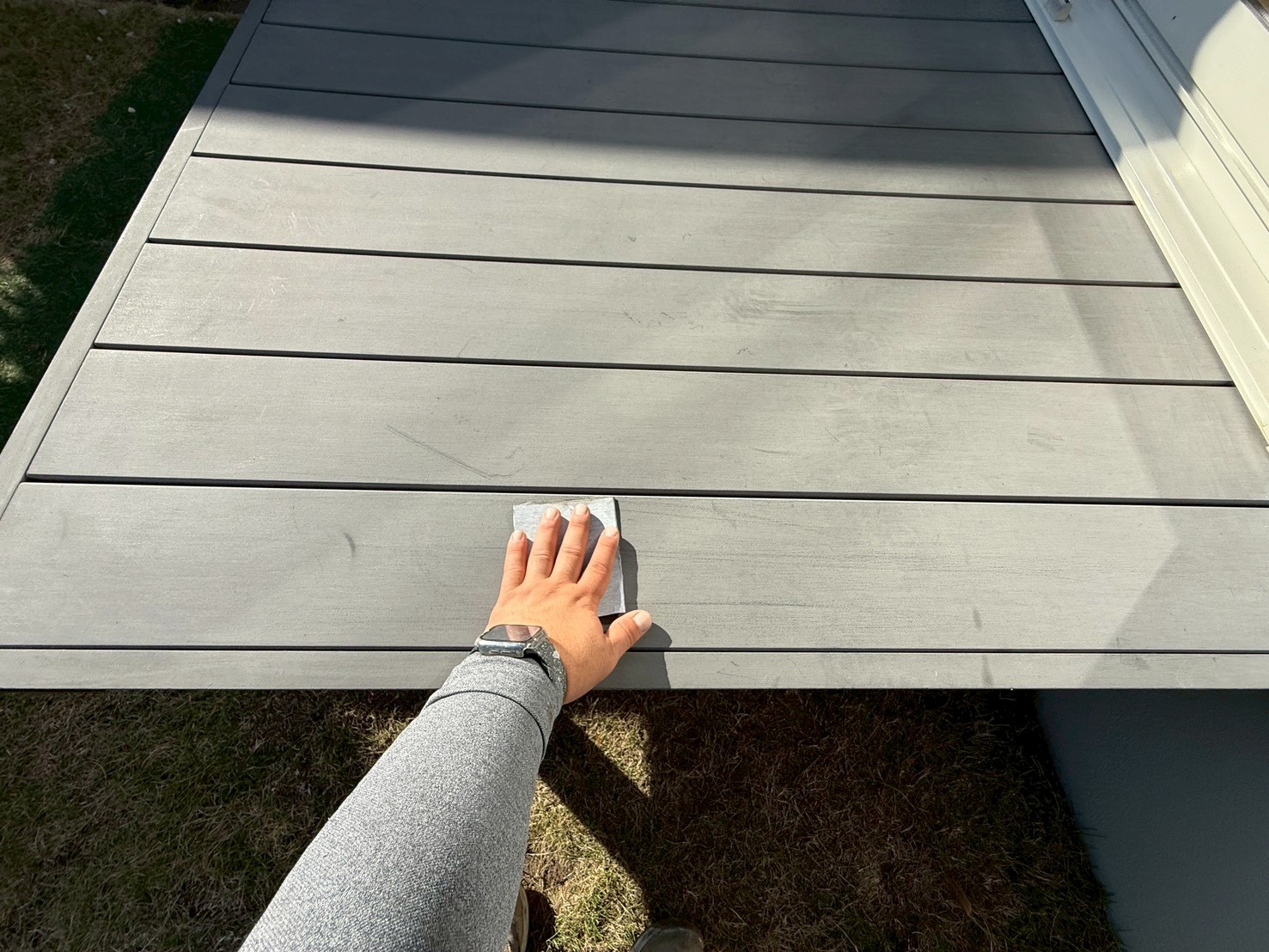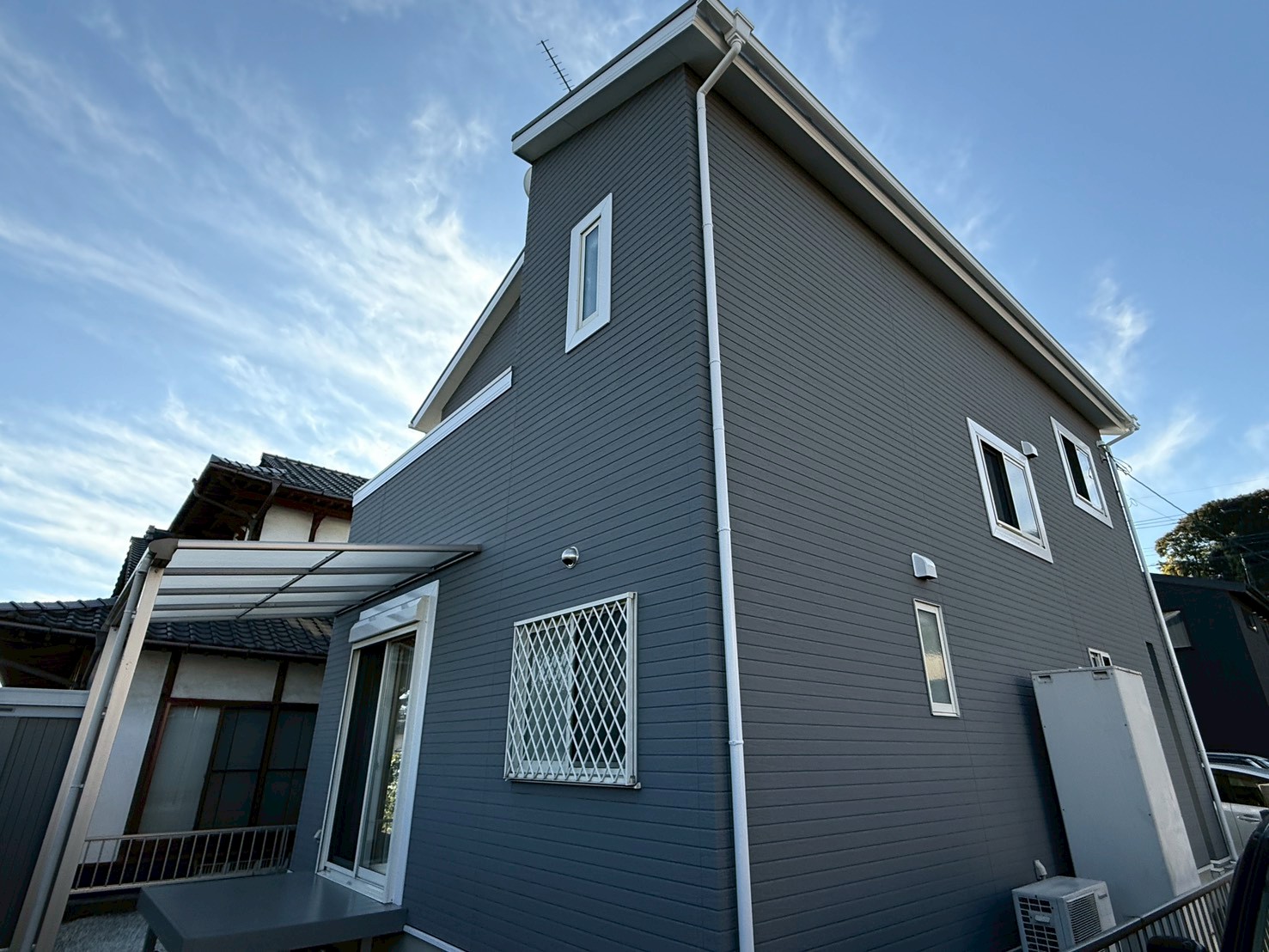 外壁・デッキテラス部・掃除、ケレン処理塗り替え施工:現状色、グレーの塗装です。