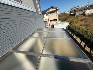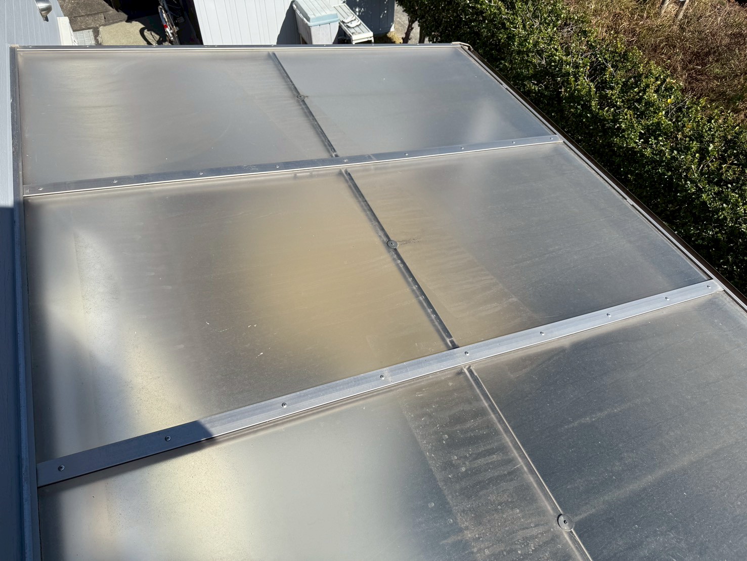 外壁・デッキテラス部・掃除、ケレン処理塗り替え施工:テラス上部の水拭き掃除施工:きれいになりました。