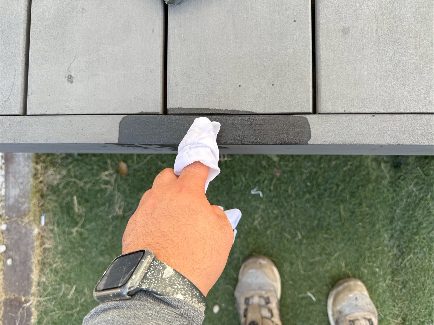 外壁・デッキテラス部・掃除、ケレン処理塗り替え施工:拭き掃除を行います。(シンナー)