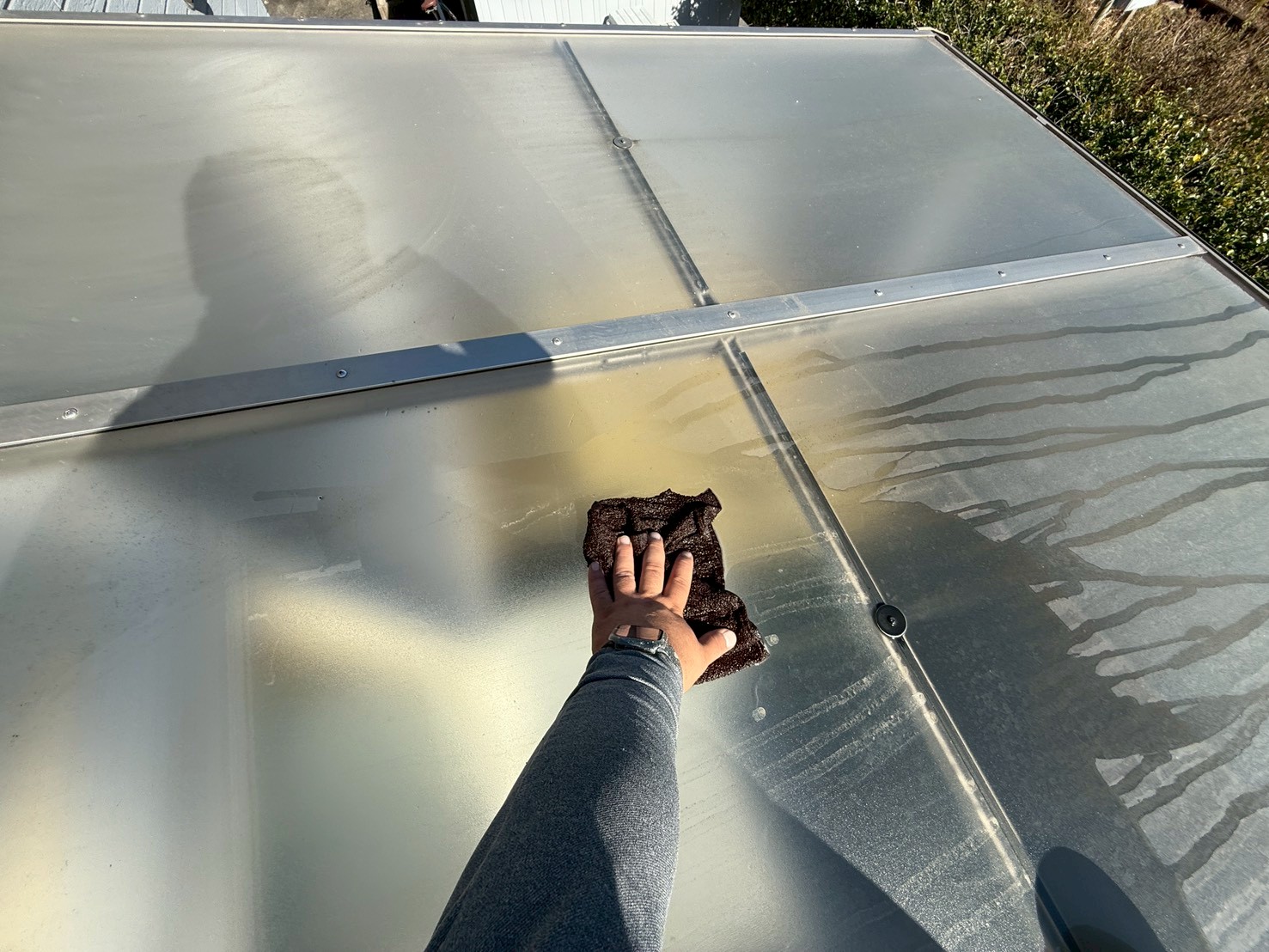 外壁・デッキテラス部・掃除、ケレン処理塗り替え施工:テラス上部の水拭き掃除施工です。