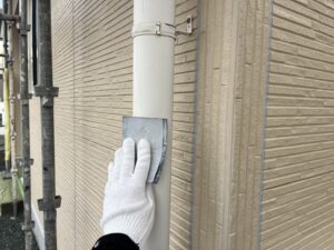 外壁・縦樋・専用下塗り:KF無機4フッ化フッ素樹脂ホワイト色の施工前、ペーパー処理ケレンです。