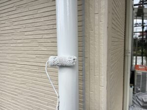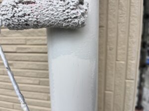 外壁・縦樋・専用下塗り:KF無機4フッ化フッ素樹脂ホワイト色の施工:ローラー塗り、アップ写真です。