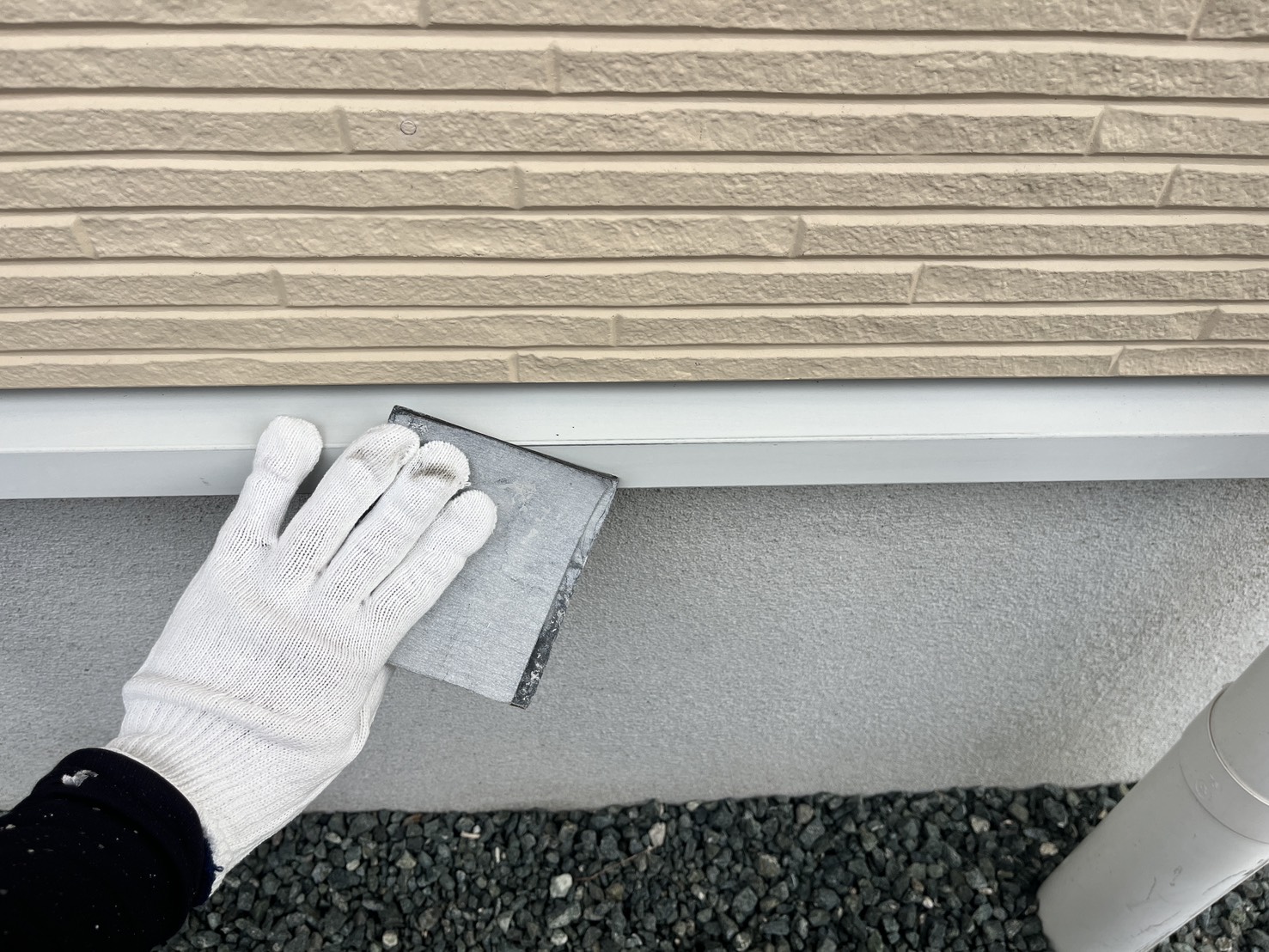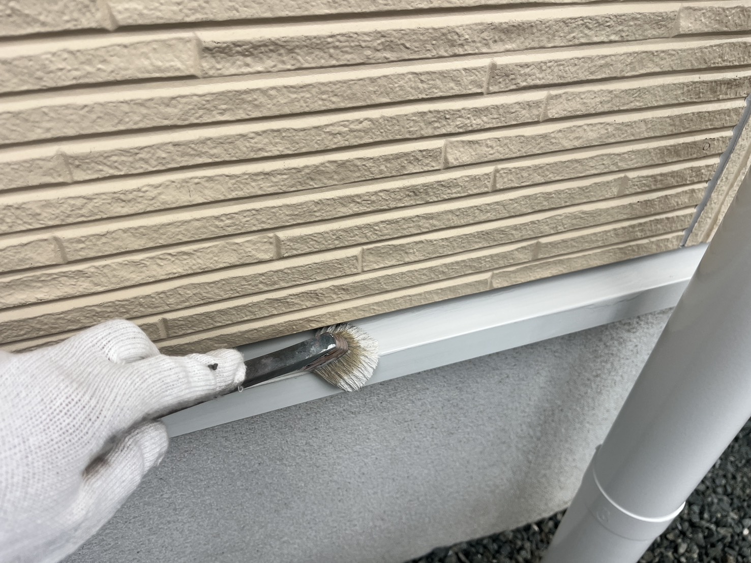 外壁・水切り部・専用下塗り:KF無機4フッ化フッ素樹脂ホワイト色の施工前、ペーパー処理ケレンです。