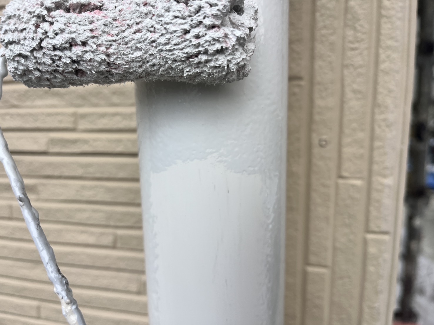外壁・縦樋・専用下塗り:KF無機4フッ化フッ素樹脂ホワイト色の施工:ローラー塗り、アップ写真です。