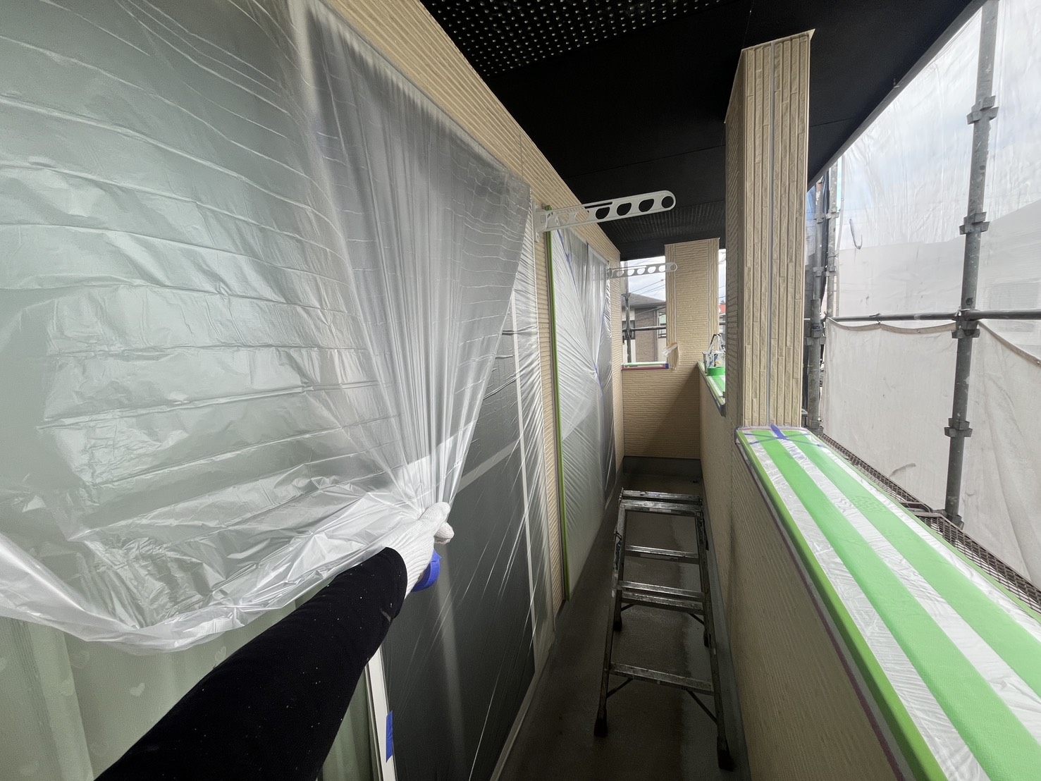 外壁・2Fベランダ内部廻り・養生の施工です。