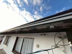 外壁・2F軒天・ブラックからホワイト色に塗り替え:ケンエースG-Ⅱ(防カビ剤入り)の施工です。