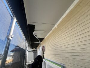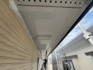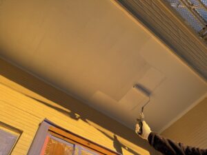 外壁・1F玄関軒天・ブラックからホワイト色に塗り替え:ケンエースG-Ⅱ(防カビ剤入り)の施工です。