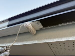 外壁・2F軒天・ブラックからホワイト色に塗り替え:上塗り仕上げ・ケンエースG-Ⅱ(防カビ剤入り)の施工です。