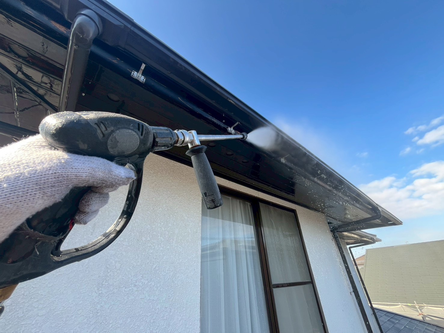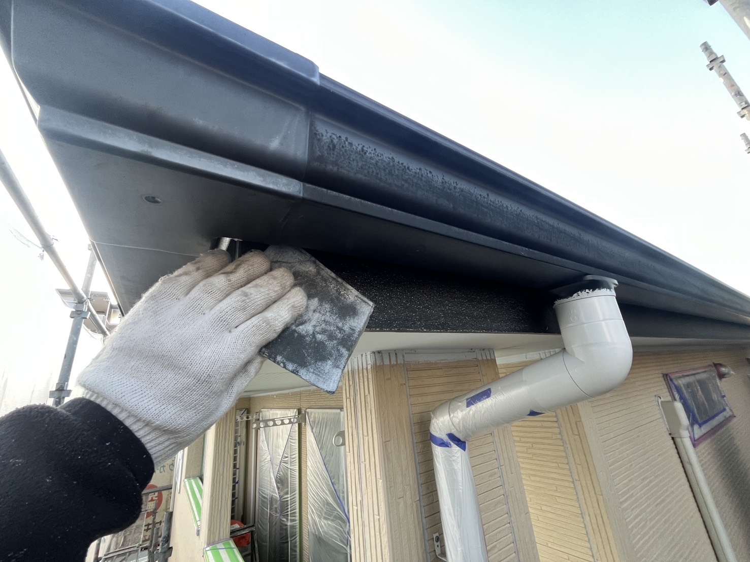外壁・雨樋(軒樋)のケレン処理施工です。