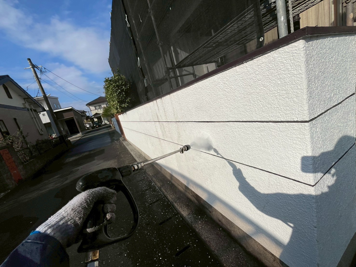 外部・門柱、塀:バイオ高圧洗浄施工中です。