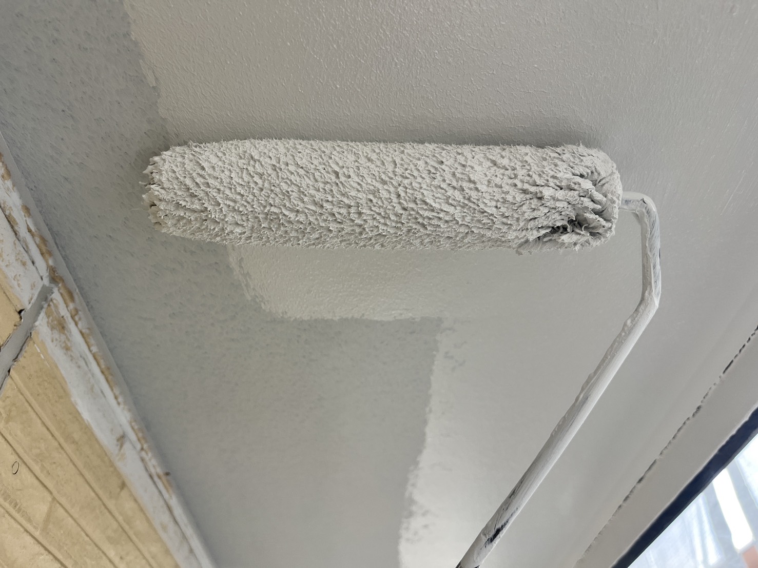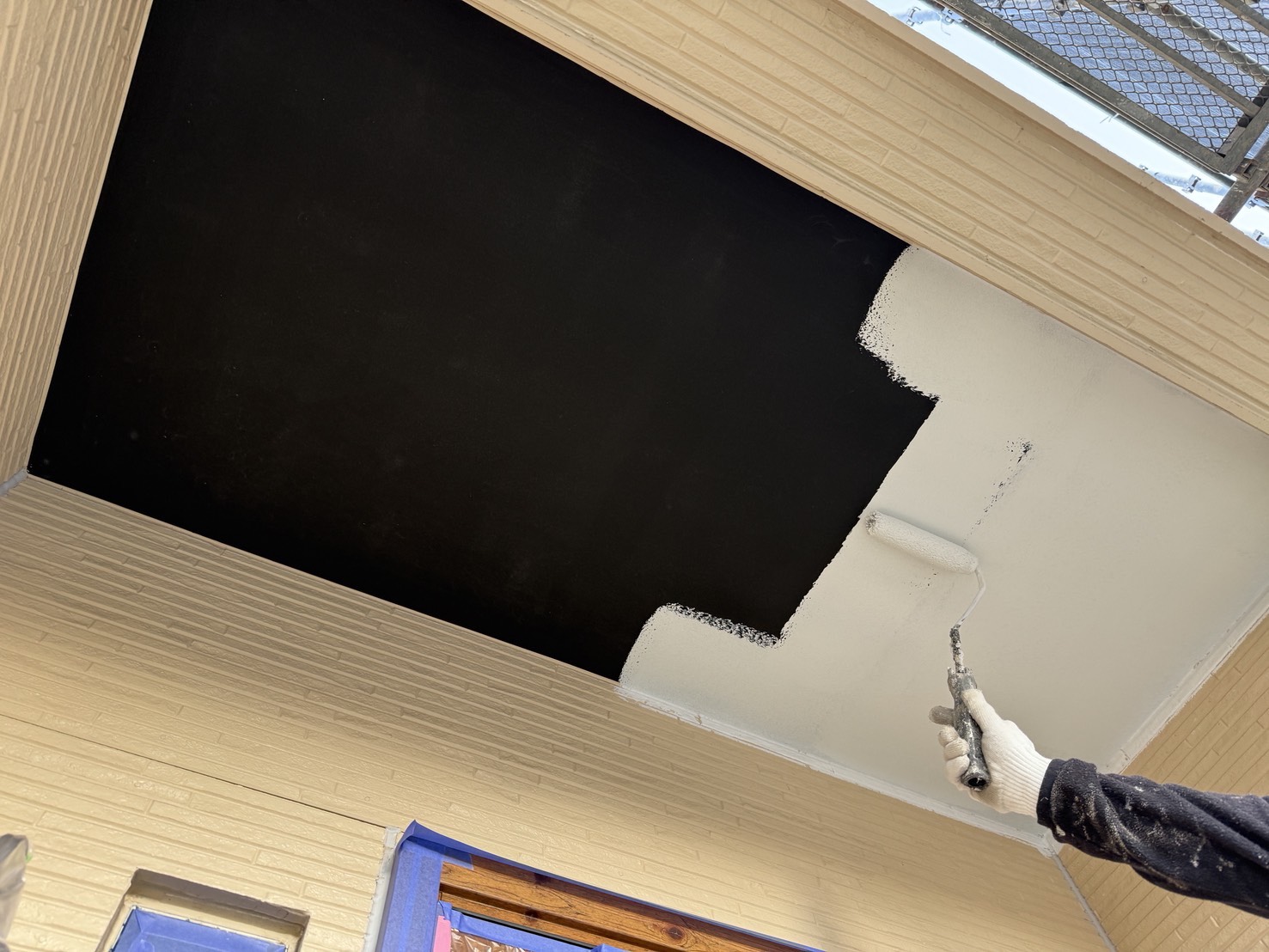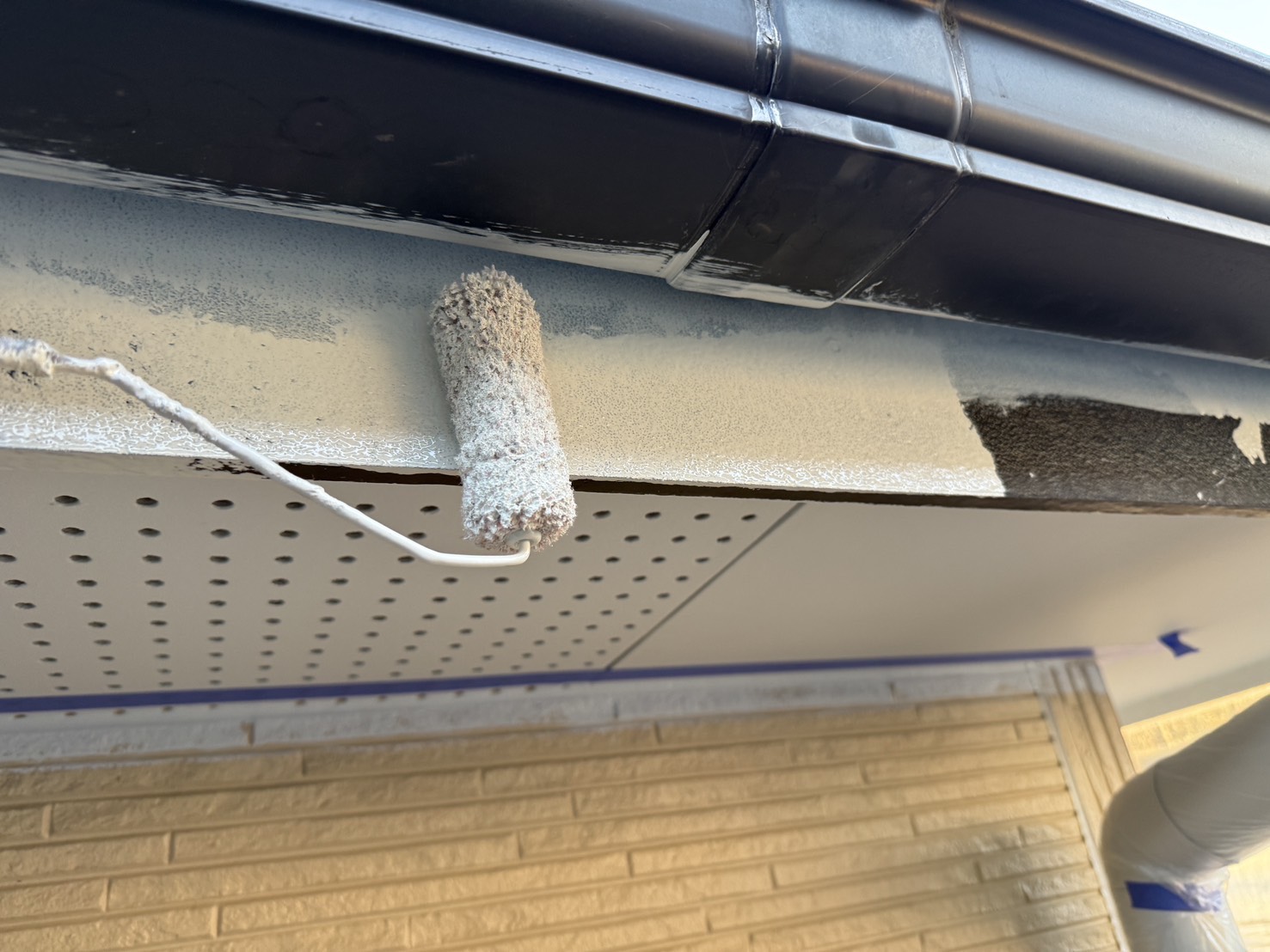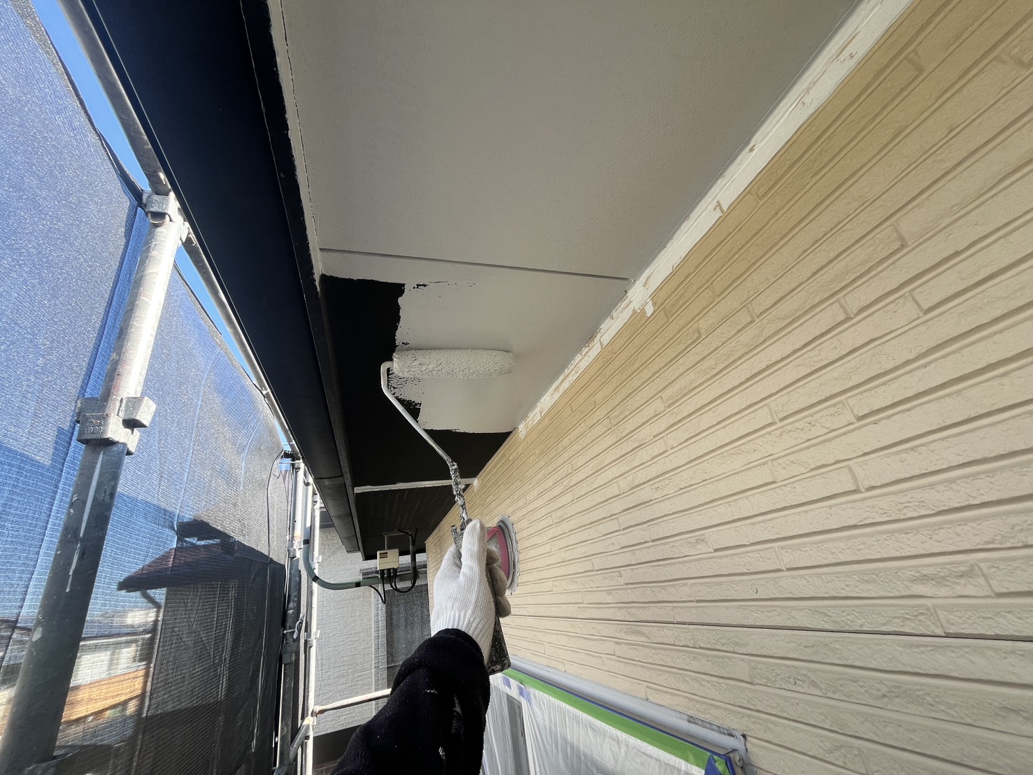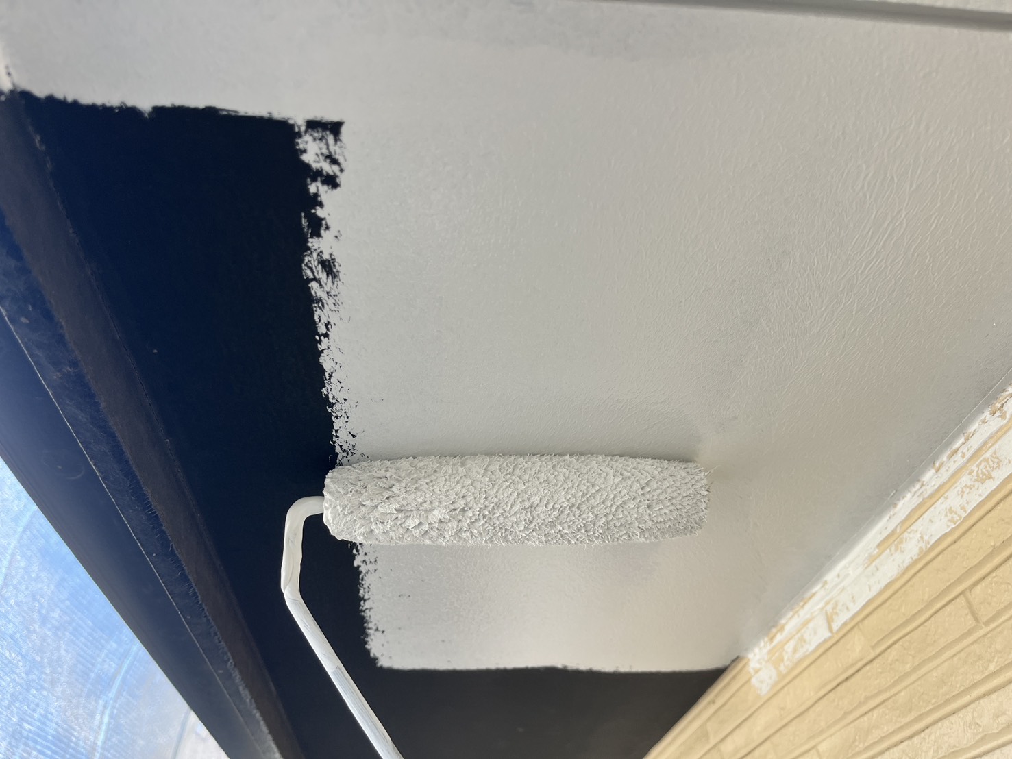 外壁・2F軒天・ブラックからホワイト色に塗り替え:上塗り仕上げ・ケンエースG-Ⅱ(防カビ剤入り)の施工です。