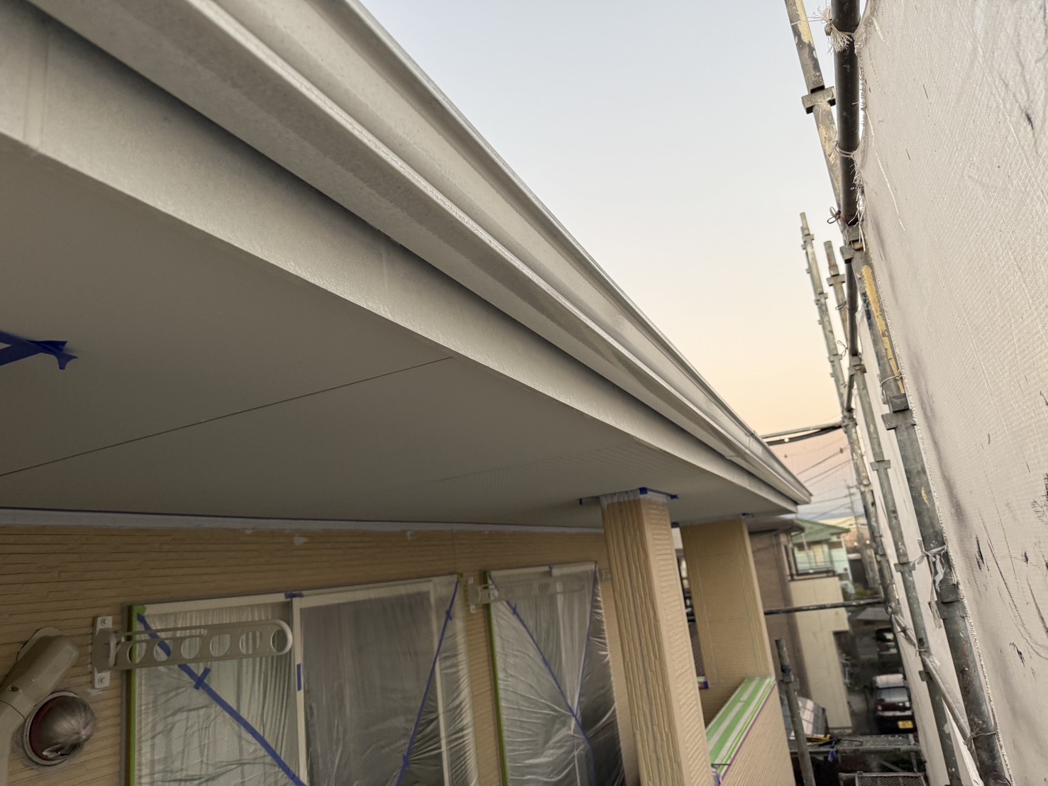 外壁・2F軒天・ブラックからホワイト色に塗り替え:ケンエースG-Ⅱ(防カビ剤入り)の施工です。