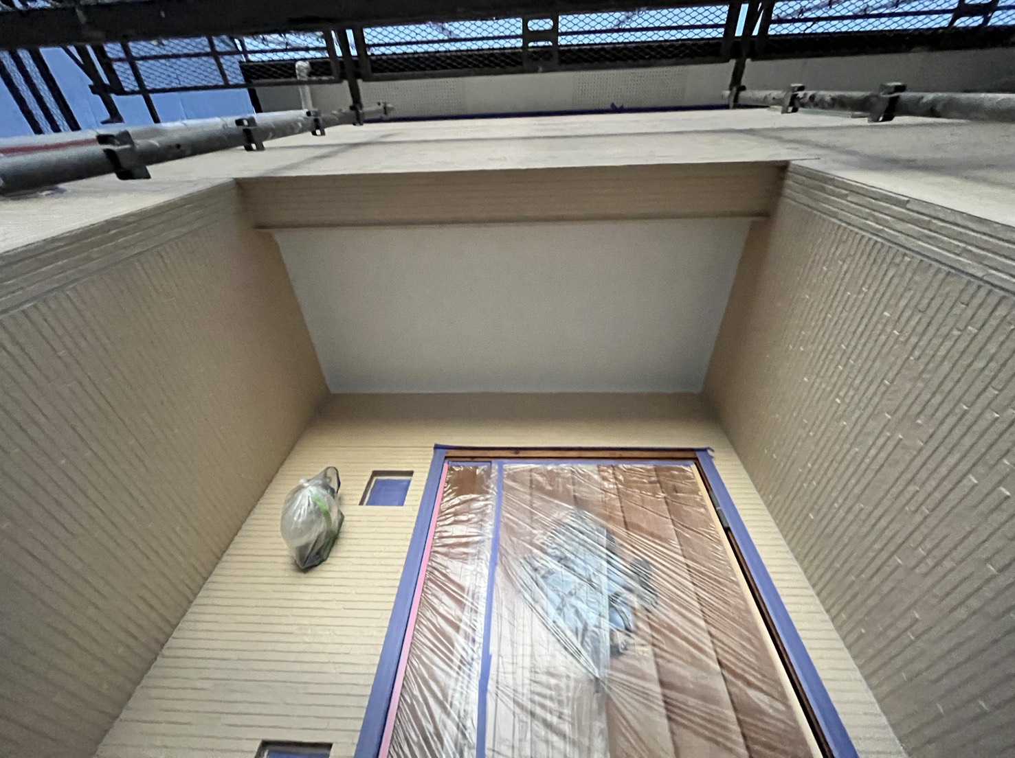 外壁・1F玄関軒天・ブラックからホワイト色に塗り替え:ケンエースG-Ⅱ(防カビ剤入り)の施工です。