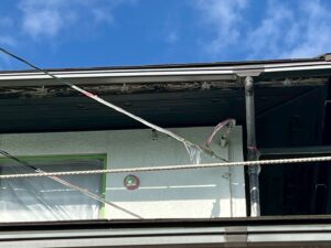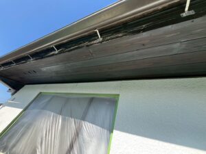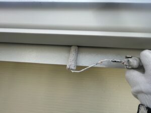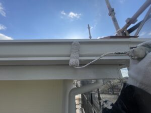 外壁・2F雨樋(軒樋):上塗り仕上げ・KF無機4フッ化フッ素樹脂ホワイト色の施工です。