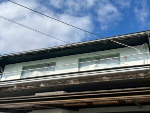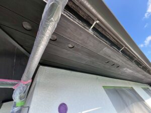 外壁・2F破風板(幕板):上塗り仕上げ・KF無機4フッ化フッ素樹脂ホワイト色の施工です。