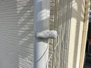 外壁・2F縦樋:上塗り仕上げ・KF無機4フッ化フッ素樹脂ホワイト色の施工です。