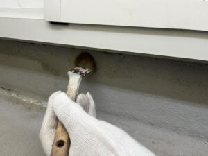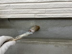 外壁・2Fベランダ床面・専用プライマー(接着剤)の施工:隅々をきれいに塗り込みます。