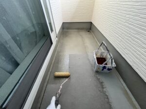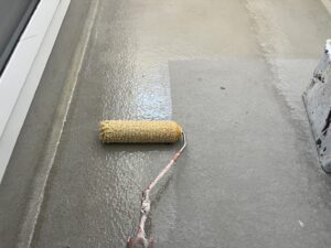 外壁・2Fベランダ床面・専用プライマー(接着剤)の施工:ローラー塗り施工です。