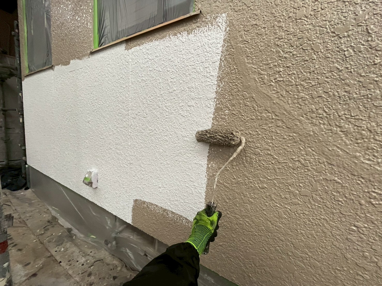 外壁・1F/2F壁面・中塗り:KF無機4フッ化フッ素樹脂の施工です。
