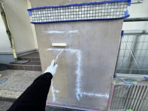 外部・玄関入り口・門柱左右の下地処理ケレンの施工:密着が良くなるように、専用シーラー接着剤の施工です。