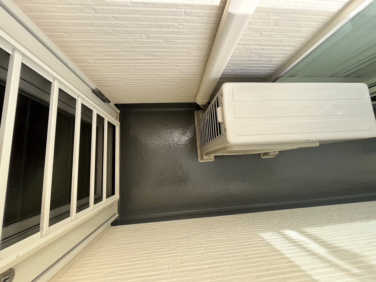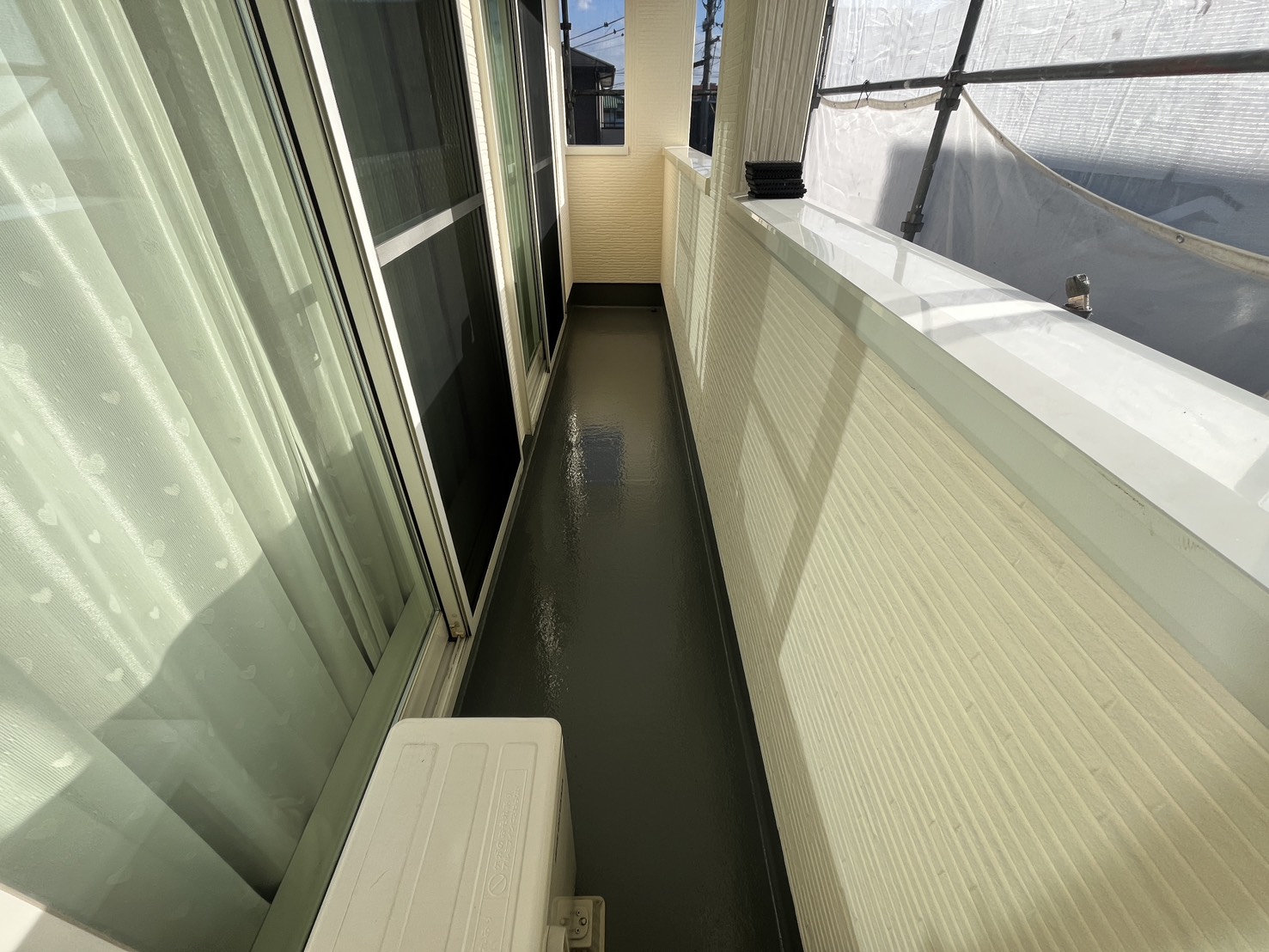 外壁・2Fベランダ床面・トップコートグレー色の施工:しっかり乾燥させます。
