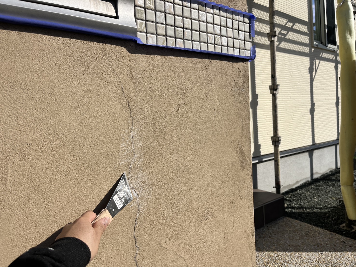 外部・玄関入り口・門柱左右の下地処理ケレンの施工:ひび割れ・クラック・コーキング補修を行いました。(裏表)