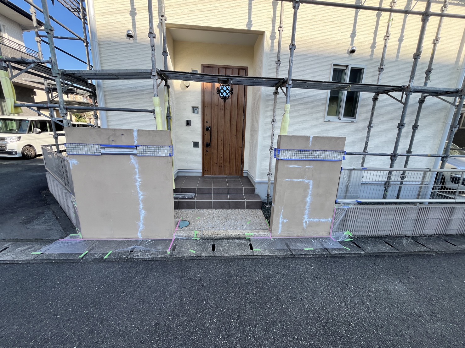 外部・玄関入り口・門柱左右の下地処理ケレンの施工:密着が良くなるように、専用シーラー接着剤の施工です。