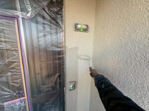 外壁・1F壁面、玄関廻り:上塗り仕上げ・KF無機4フッ化フッ素樹脂のローラー塗り施工です。
