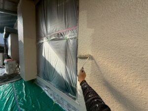 外壁・2F出窓廻り:上塗り仕上げ・KF無機4フッ化フッ素樹脂のローラー塗り施工です。