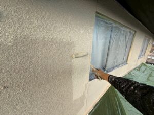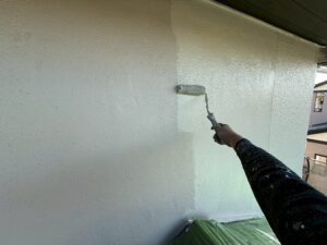 外壁・2F壁面東側:上塗り仕上げ・KF無機4フッ化フッ素樹脂のローラー塗り施工です。
