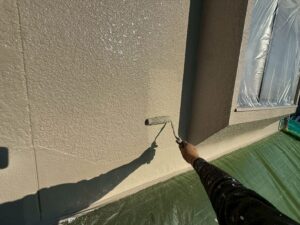 外壁・1F壁面、南面側:上塗り仕上げ・KF無機4フッ化フッ素樹脂のローラー塗り施工です。