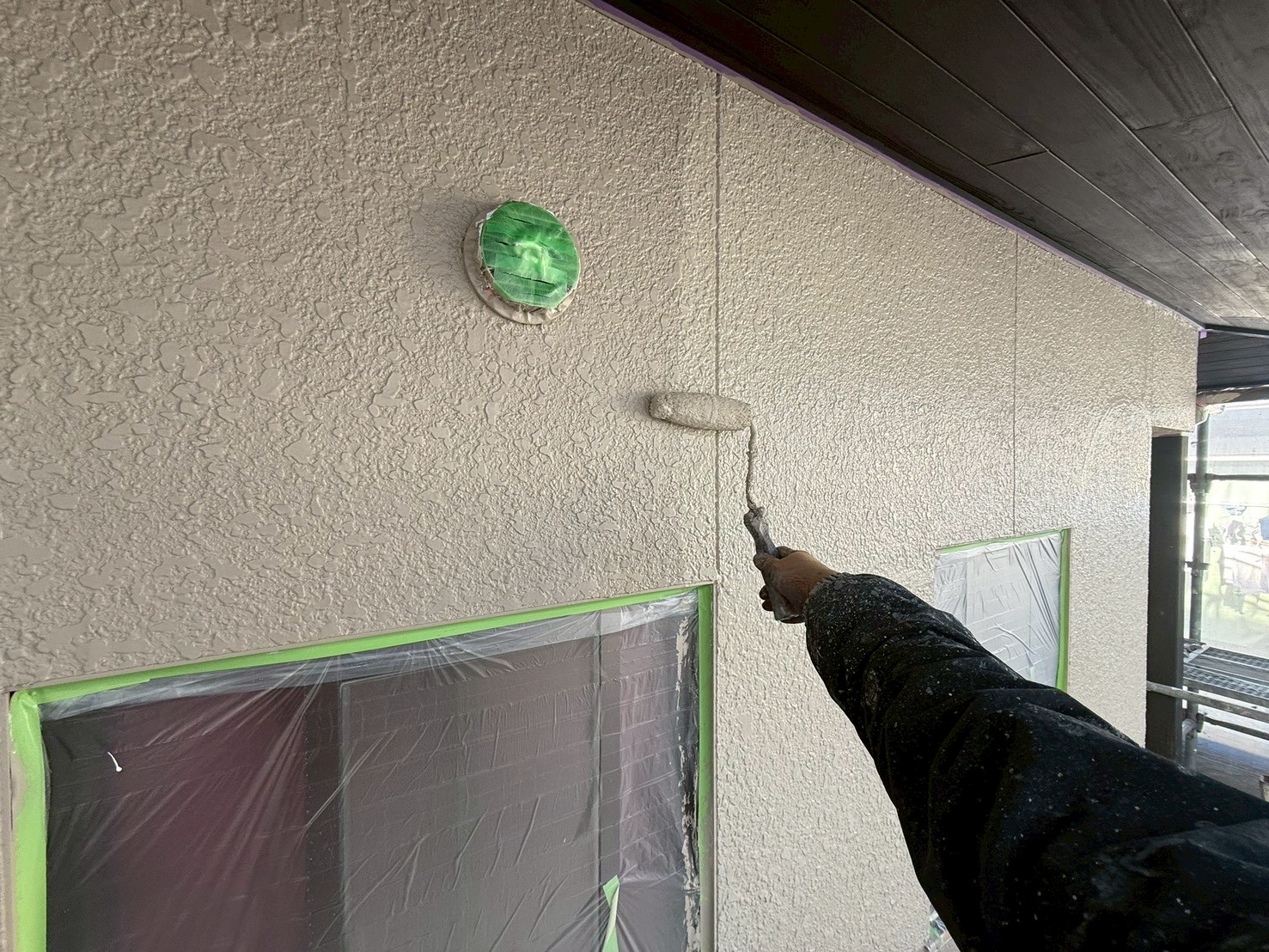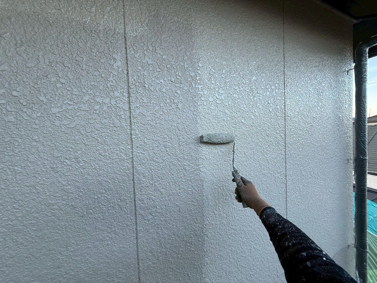 外壁・1F壁面、南面側:上塗り仕上げ・KF無機4フッ化フッ素樹脂のローラー塗り施工です。