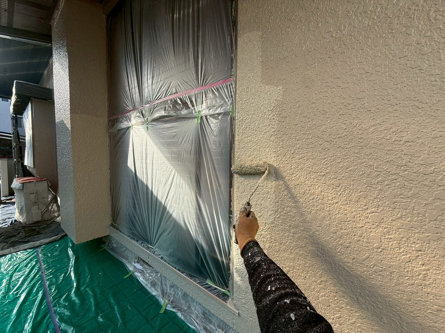 外壁・1F壁面、玄関廻り:上塗り仕上げ・KF無機4フッ化フッ素樹脂のローラー塗り施工です。