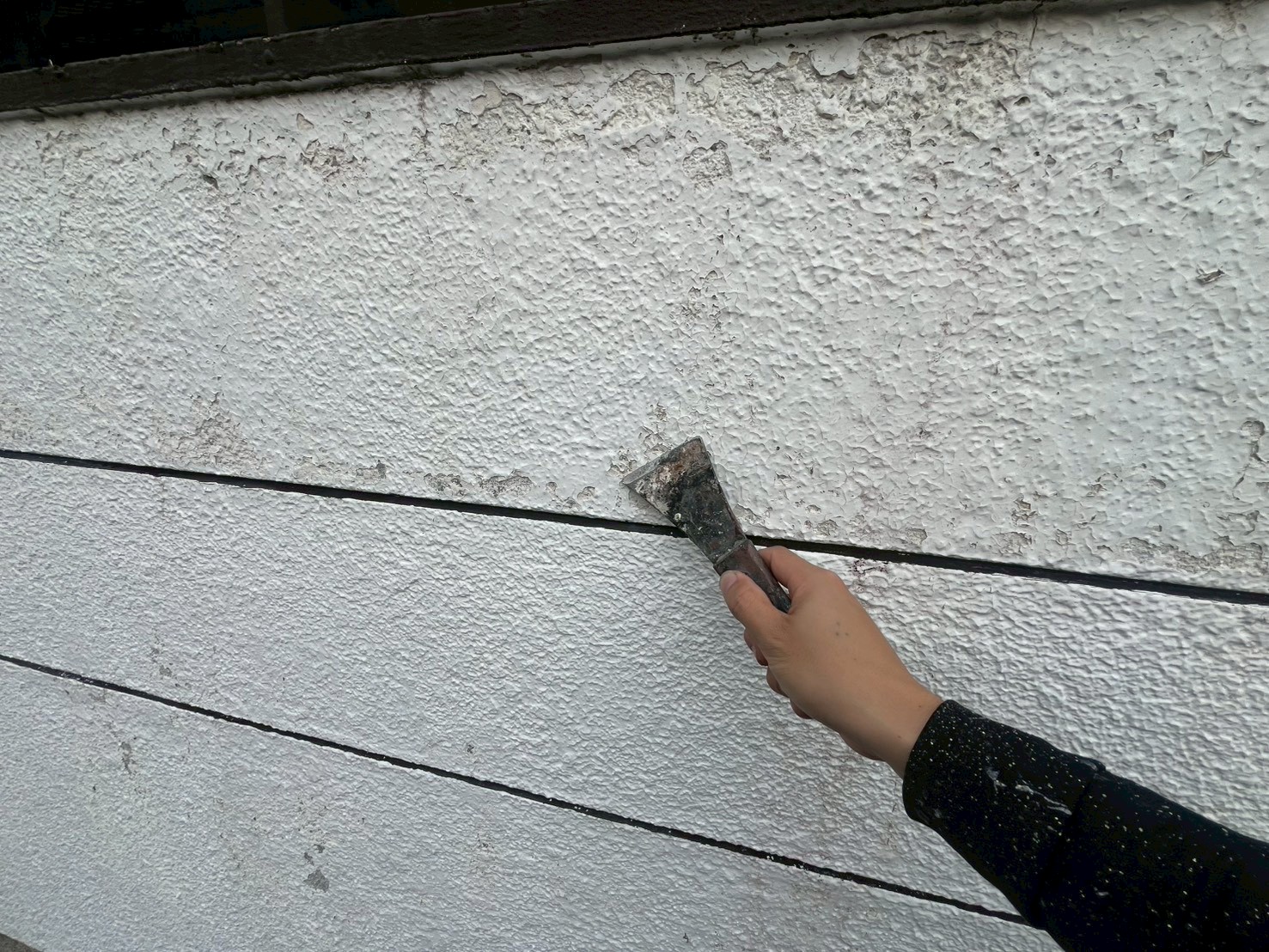 外部・左右門柱(裏表)の施工:旧塗膜を剥ぎ取ります。