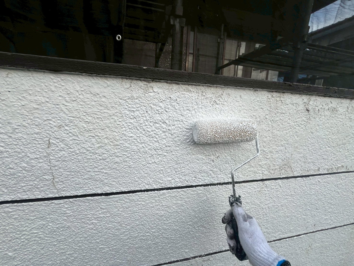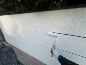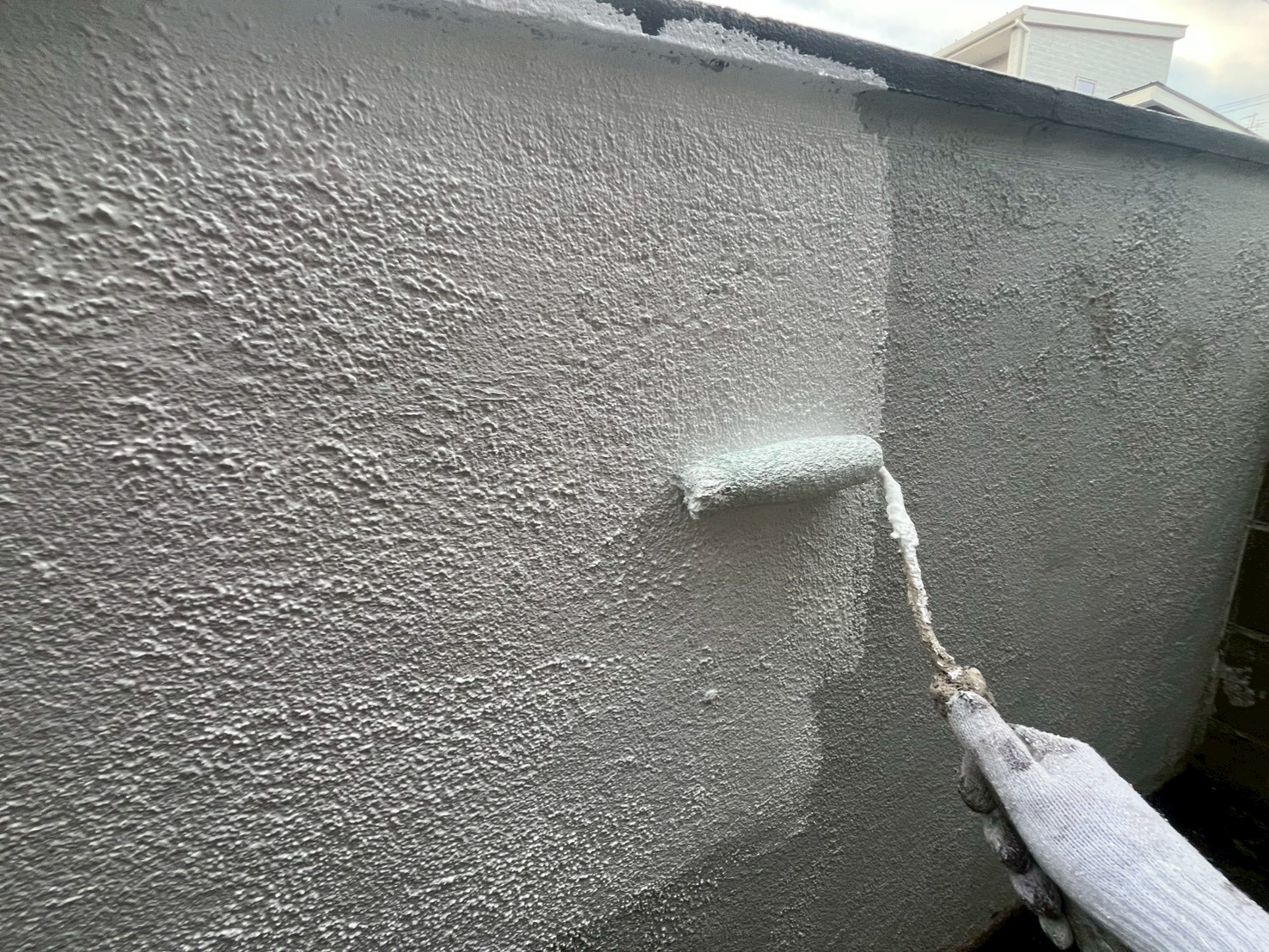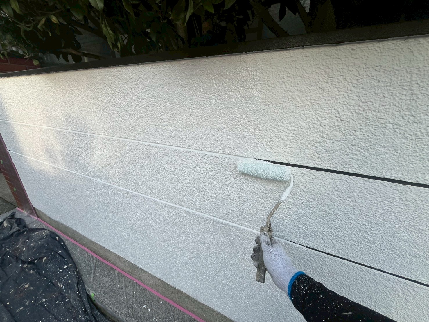 外部・左右門柱・裏面の中塗り施工:ラジカル塗料の施工です。