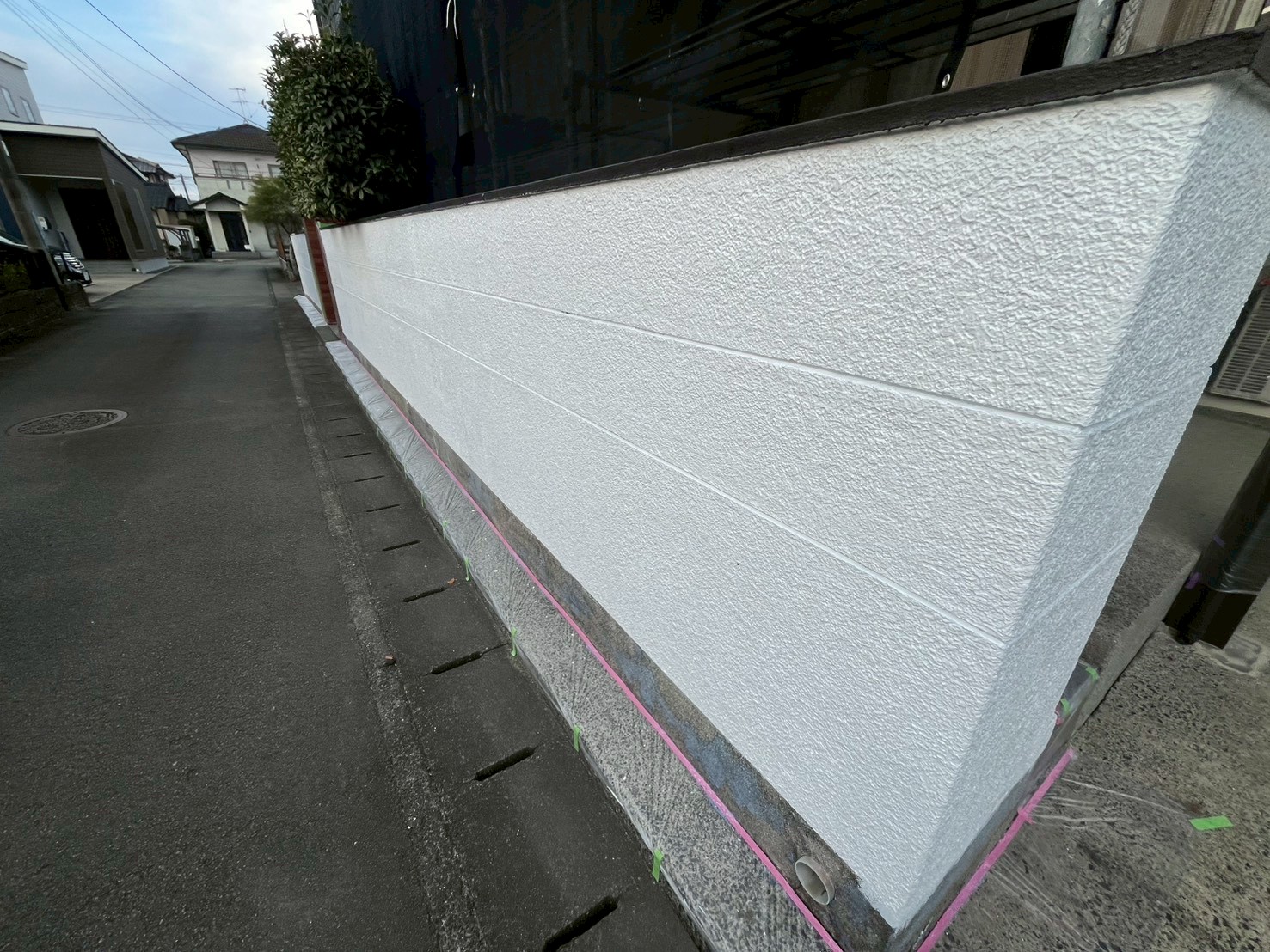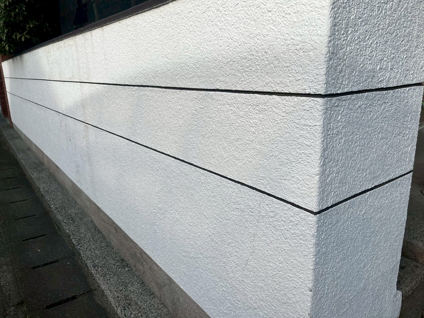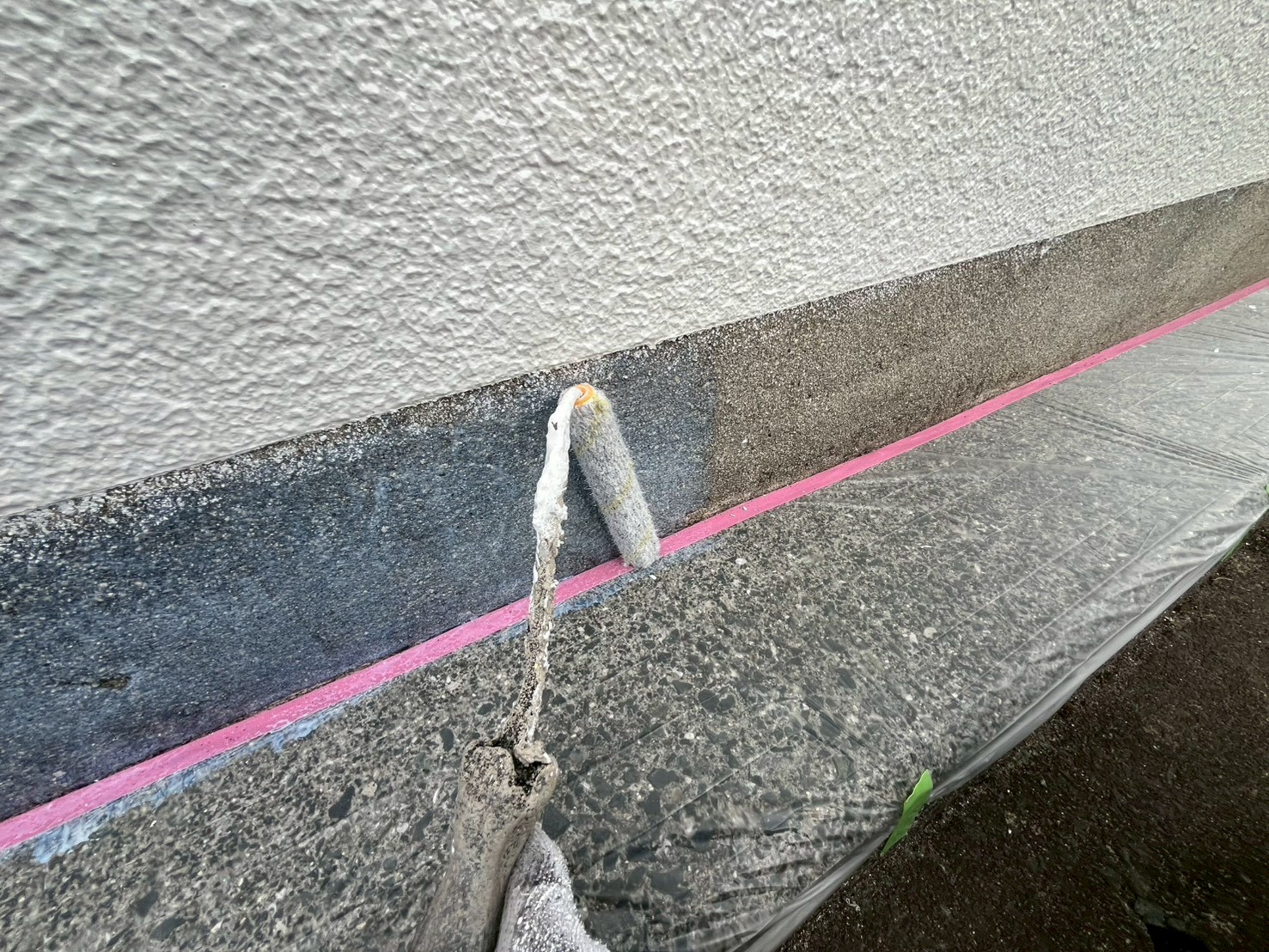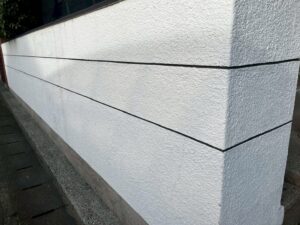 外部・左右門柱(裏表)の施工:巾木部分も塗り込みます。