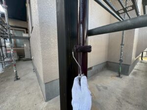 外壁・縦樋・中塗り:KF無機4フッ化フッ素樹脂コーヒーブラウンのローラー塗り施工です。