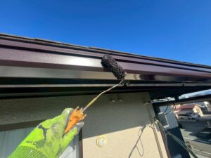外壁・雨樋(軒樋)・中塗り:KF無機4フッ化フッ素樹脂コーヒーブラウンのローラー塗り施工です。