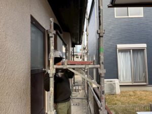 外壁:架設足場解体・飛散防止ネット撤去の施工前です。