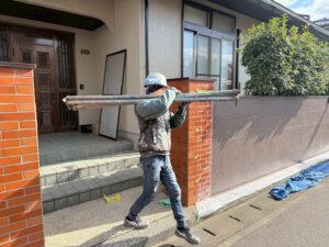 外壁:架設足場解体・飛散防止ネット撤去の施工:足場部材の運び出しです。