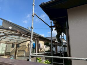 外壁:架設足場解体・飛散防止ネット撤去の施工:落下防止手摺りの取り外しです。