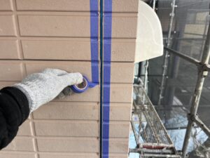 外壁・壁面(コーナー部)、旧コーキング撤去作業施工後、専用コーキングテープ貼りの施工です。