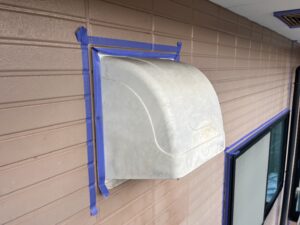 外壁・壁面(フード部・窓廻り)、旧コーキング撤去作業施工後、専用コーキングテープ貼りの施工です。