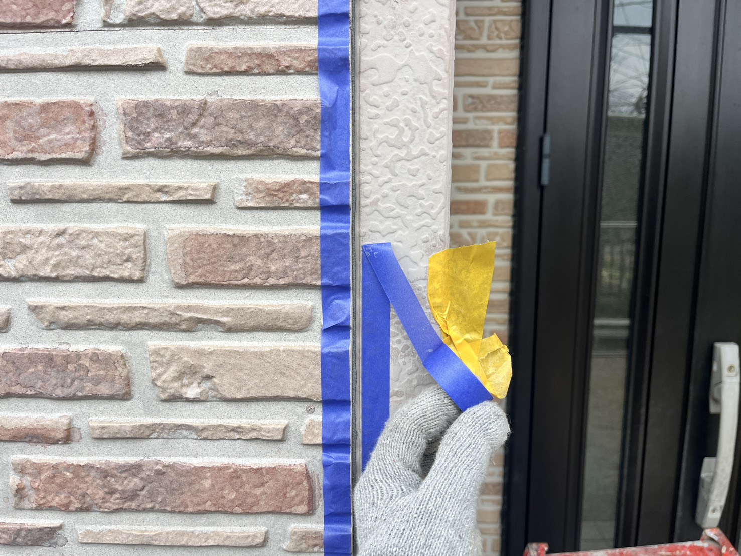 外壁・壁面(アクセントクリアー仕上げ部)、旧コーキング撤去作業施工後、専用コーキングテープ貼りの施工です。