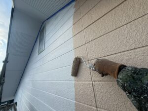 外壁・2F壁面・エスケープレミアムシリコンラジカル塗料(SR-411色)のローラー塗り施工です。
