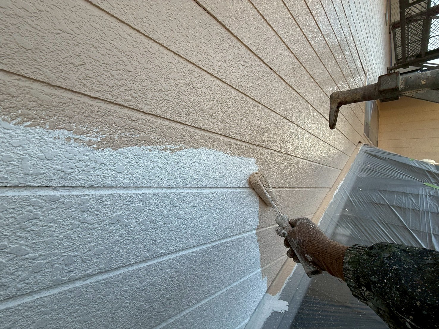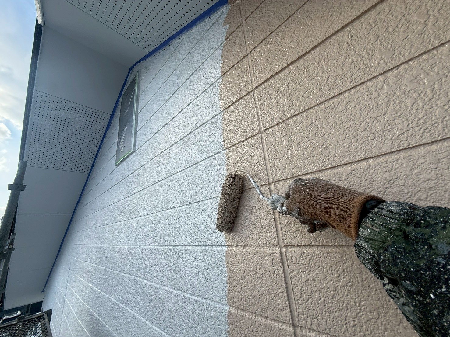 外壁・2Fベランダ内壁・エスケープレミアムシリコンラジカル塗料(SR-411色)のローラー塗り施工です。