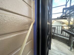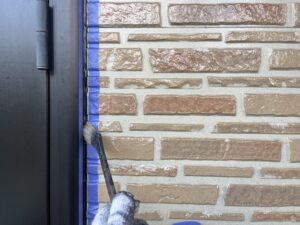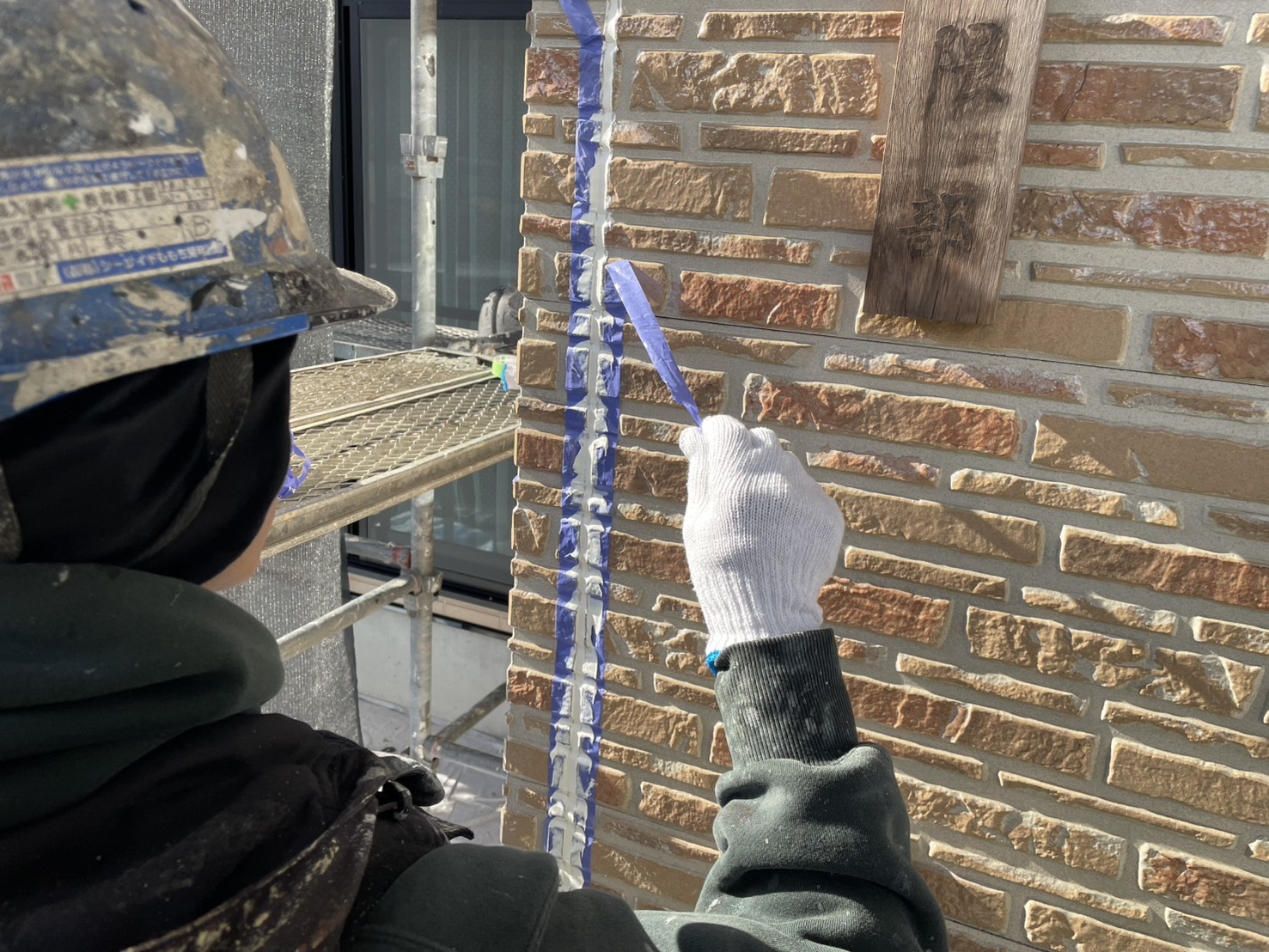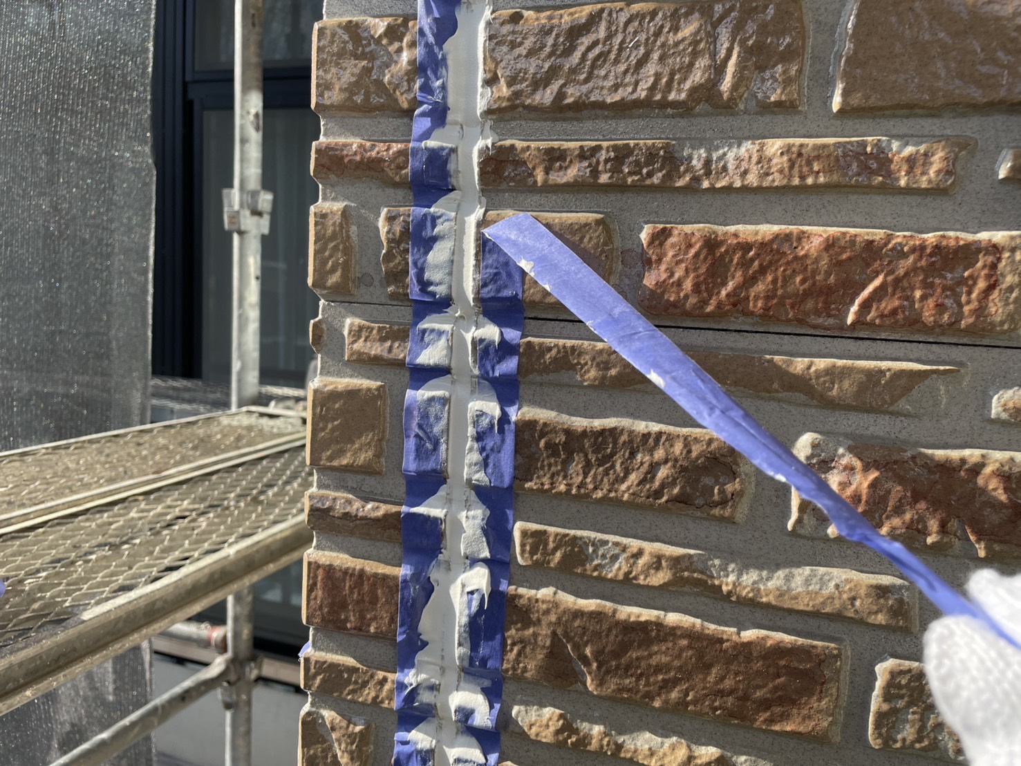 外壁・クリアー仕上げ部・化粧コーキング打ち替え施工:乾燥する前に、テープを剥がします。