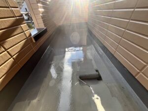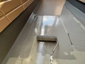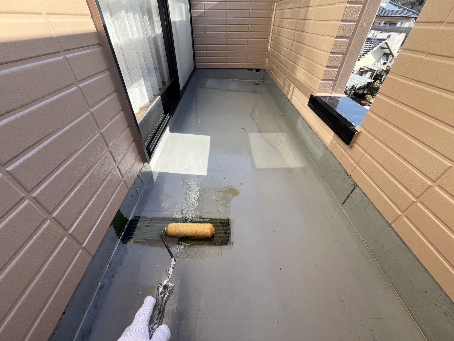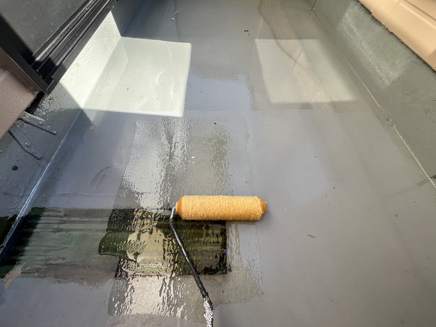 外壁・2Fベランダ床面・上塗り仕上げ、トップコートグレーのローラー塗り施工です。