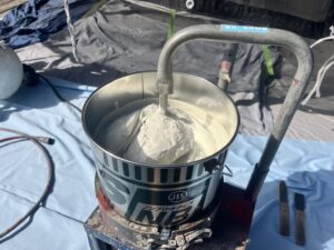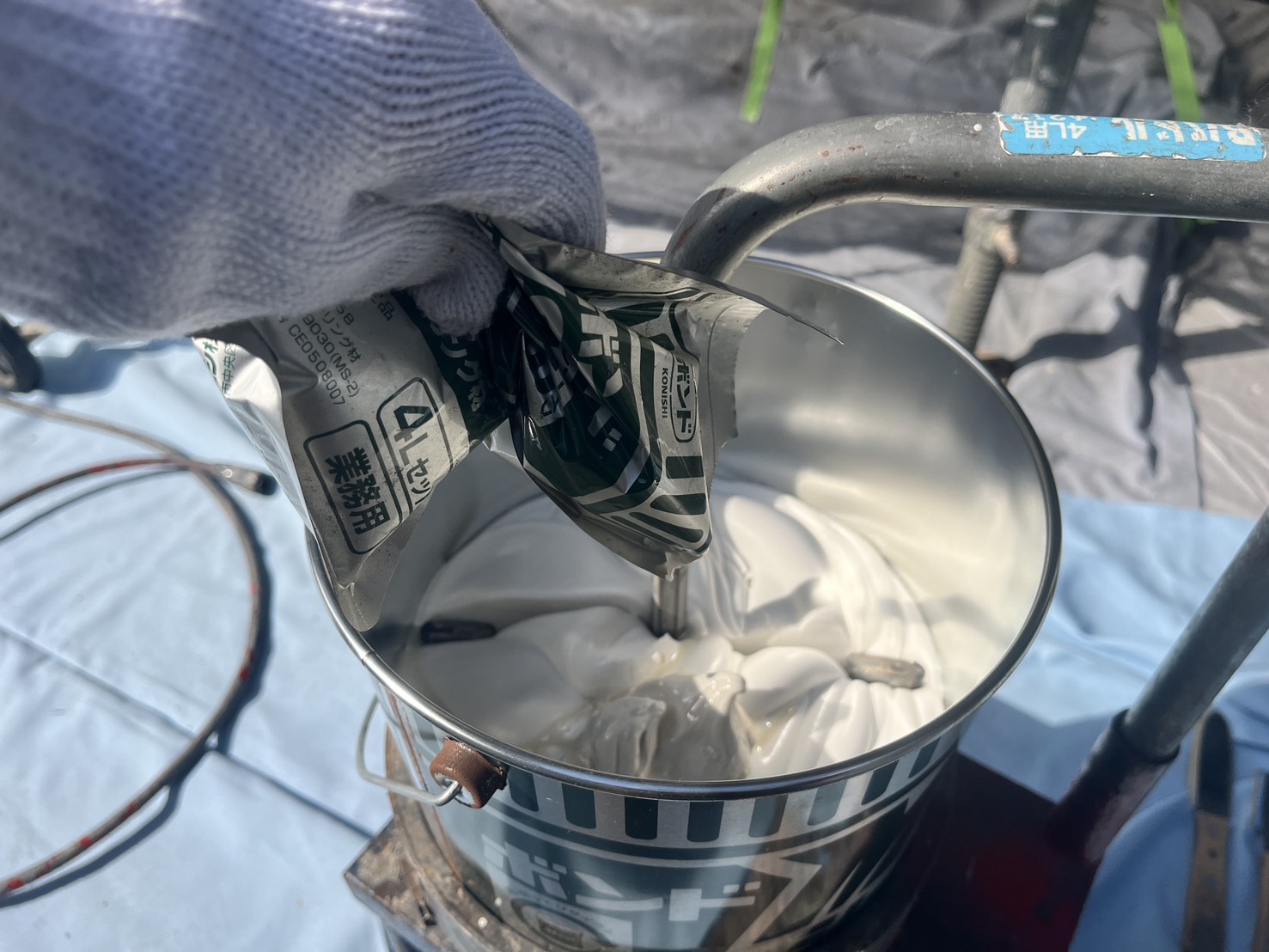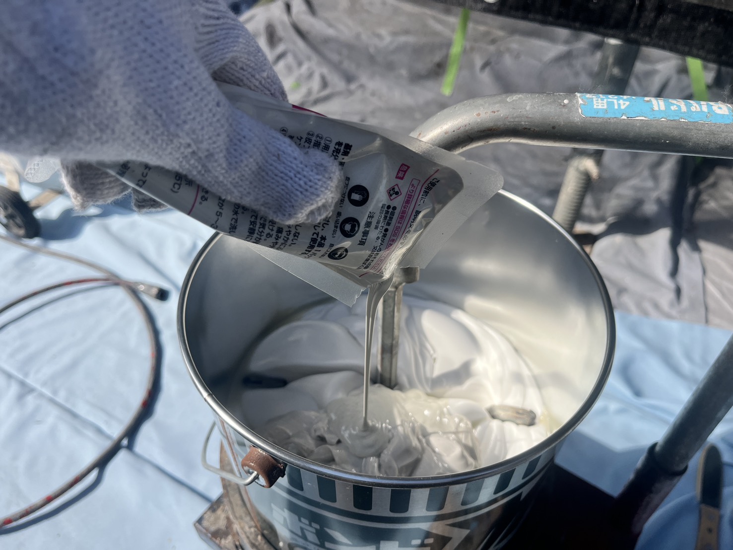外壁・クリアー仕上げ部・化粧コーキング撹拌の施工です。